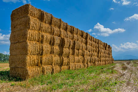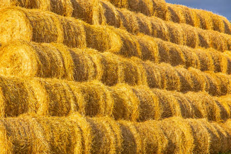 Straw bales stacked background. Harvested field with bales, wheat harvesting for bread production. high quality photo