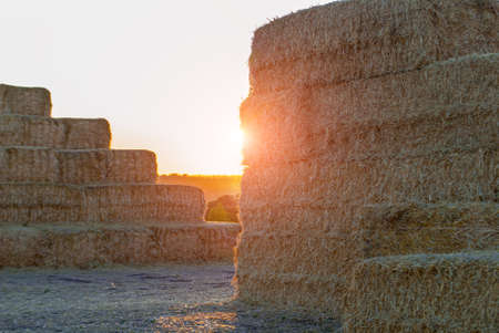 Rolls of haystacks on the field. Summer farm scenery with haystack on the Background of beautiful sunset. Agriculture Concept.