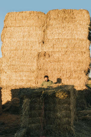 Haystack harvest spring field landscape. Haystack agriculture field landscape. Agriculture field haystacks. rural yellow field