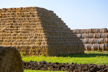 Storage of hay and straw in bales and rolls on the farm. Concept theme: Stock raising. Food security. Agricultural. Farming. Food production.