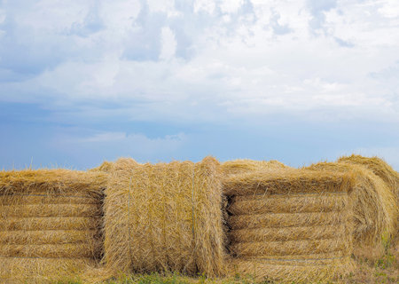 Stacks of hay in summer in yellow field with copyspace. Close up front view