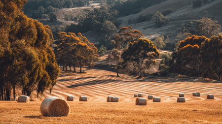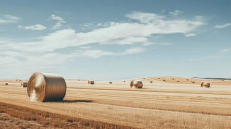 Discover a tranquil rural landscape showcasing bales of hay scattered across golden fields. Captured in warm afternoon light, this scene embodies nature's beauty and serenity.