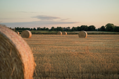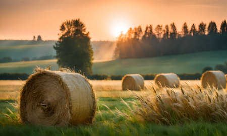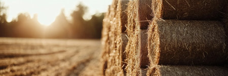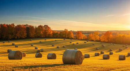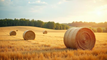 Golden farmland with hay bales illuminated by the warm evening sun. Peaceful autumn landscape ideal for agriculture, nature, or lifestyle visuals.