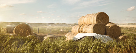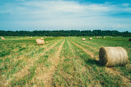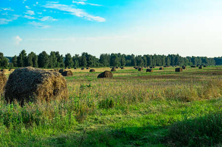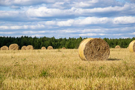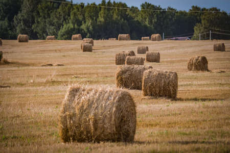 Hay bales on the agricultural field after harvest sunny summer day, Cultivated Field, horizontal