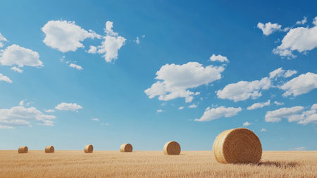 AI Generated. Peaceful Countryside Field with Hay Bales Under a Bright Blue Sky