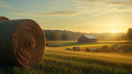 Golden hour illuminates a serene countryside landscape with hay bales in the foreground and a rustic barn under a colorful sky