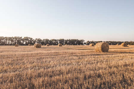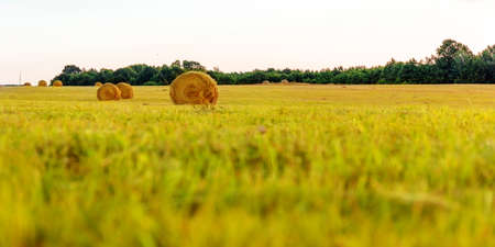 Bright yellow dry Rolls of haystacks on the summer field. Rural landscapes