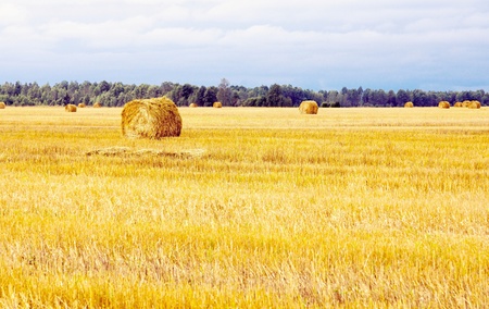 field with straw bales, harvest time
