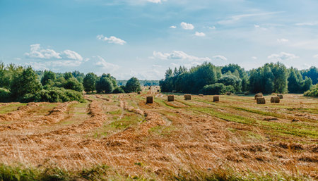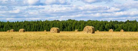 big field with round sheaves of yellow straw after a crop harvest and the blue sky and a green forest belt on the horizon