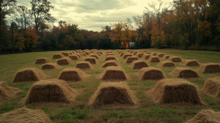 Stacks of freshly harvested hay bask in the sunlight, surrounded by colorful fall foliage in the countryside.