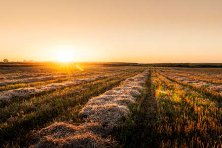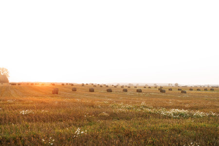 Field with hay bales at sunset. Summer harvest landscape.