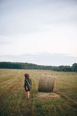 Beautiful stylish woman in hat walking at hay bales in summer evening field. Happy young female relaxing at haystacks, vacation in countryside. Tranquility, countryside slow life