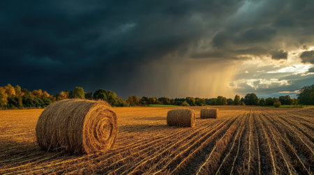 A field with bales of hay under a dark sky, AI