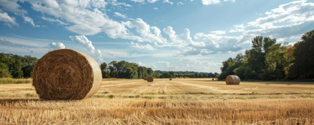 A tranquil rural landscape with large round hay bales spread across a freshly cut field, evoking the simplicity of farm life.