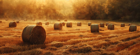An idyllic scene of a field with hay bales arranged in rows, illuminated by the soft light of the early morning sun, symbolizing the start of a new harvest day.