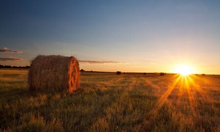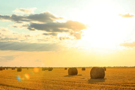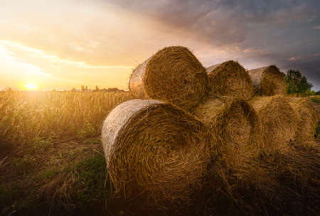 Rolls of haystacks on the field. Summer farm scenery with haystack on the Background of beautiful sunset. Agriculture Concept.