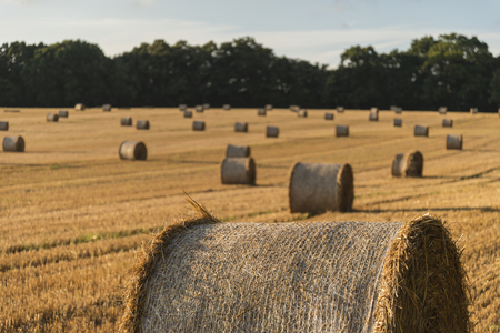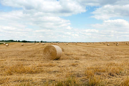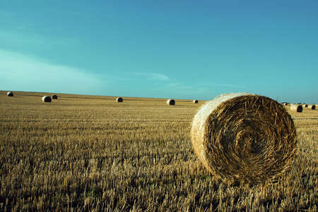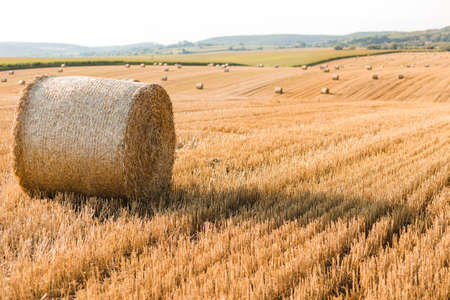 Beautiful landscape of agricultural wheat field - Round bundles of dry grass in the field,bales of hay