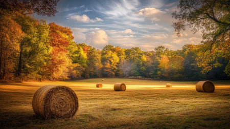 a golden field with hay bales at sunset, casting long shadows across the harvested countryside landscape