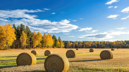 Bright rural scene with haystacks in farm field during sunny autumn morning.