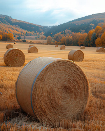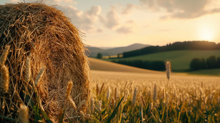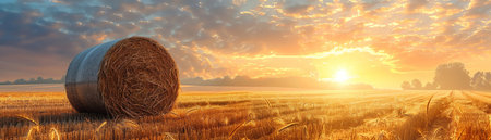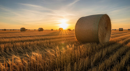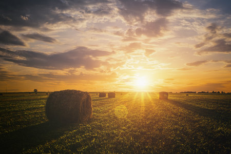 Scenic of sunset over hay bales in a field. Golden light bathes the landscape, creating a tranquil scene. For agriculture, travel and inspiring greeting card designs. Vintage film aesthetic.