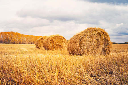A field with haystacks on an autumn evening with a cloudy sky in the background at sunset or sunrise. Procurement of animal feed in agriculture.