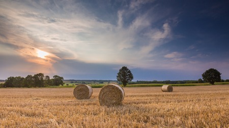 Beautiful yellow field with haystacks at sunset, Alsace, France