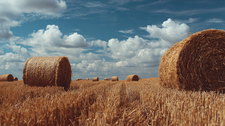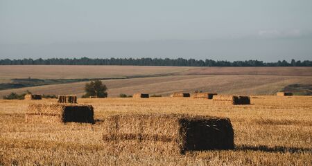 Haystacks straw left after harvesting wheat, Field Landscape with Rolls and Sky, Agriculture Concept