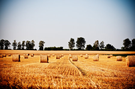 Stubble field with straw bales. Beautiful summertime rural landscape photographed in Poland.