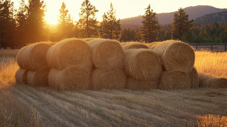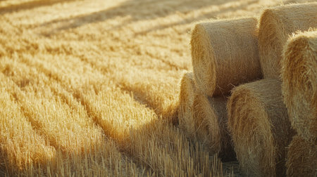 Golden straw bales rest on a sunlit wheat field, showcasing the beauty of harvest season. The serene landscape captures the essence of rural agriculture.