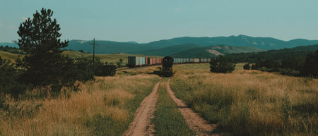 Freight train traversing a scenic rural landscape amidst rolling hills and greenery