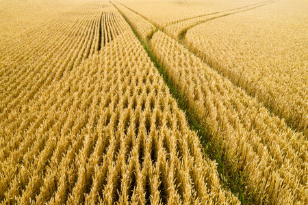 Traces of tractors in the high dry grass in nature, note shallow depth of field