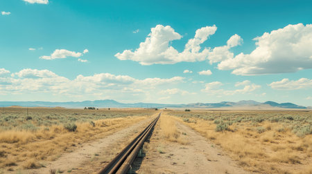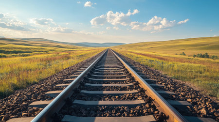 A steel train track extends into the distance under a clear blue sky with fluffy white clouds. The track runs straight ahead, disappearing into the horizon, contrasting with the vast expanse of the open sky.
