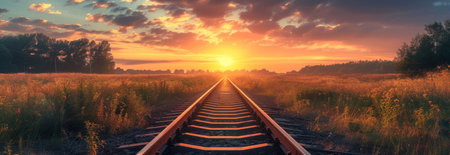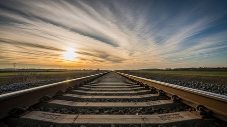 The photograph captures a railway line extending towards the horizon under a vast sky. The composition emphasizes the converging tracks, creating a perspective that draws the viewer's eye. The image exhibits warm colors of the sunset, suggesting an outdoor setting suitable for various editorial and commercial applications.