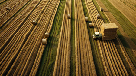 Harvested hay is carefully stacked under a sunny sky, surrounded by autumn foliage, capturing the essence of fall agriculture.