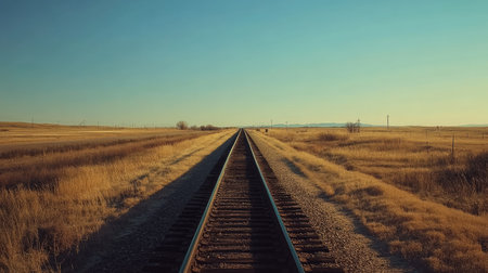 A serene sunset illuminates distant railroad tracks, creating a tranquil atmosphere. The golden light reflects on the metal, inviting thoughts of adventure and exploration.