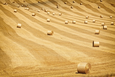 long straight rows of straw after harvesting grain, landscape in the middle or late summer,