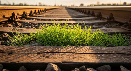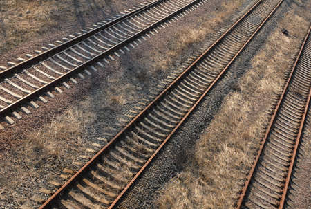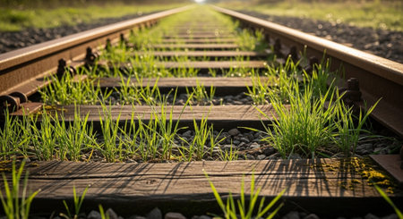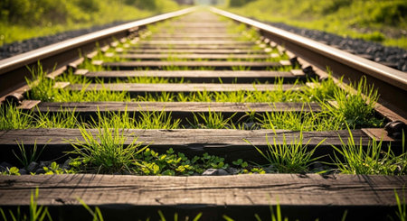 Poor condition of mainline train tracks. Heavy gauge normal train tracks with wooden sleepers but with grass growing up betwee gravel due to poor maintenance of infrastructure. Photo with an old vintage lens.