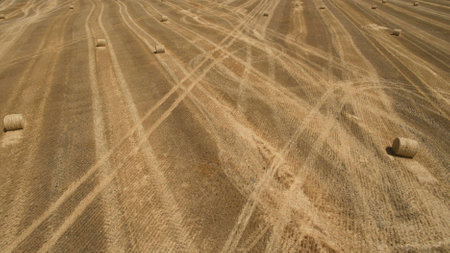 High angle top-down cinematic view of cylindrical hay bales stacked precisely in a row under harsh s