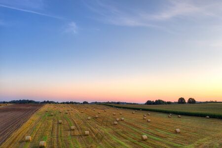 Hay bales on the field at sunset. Rural landscape with hay bales on the field.