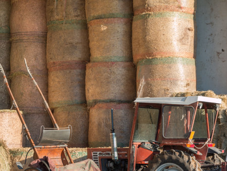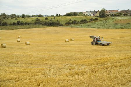 Round Bundles of Haystacks and Tractor in Countryside Location