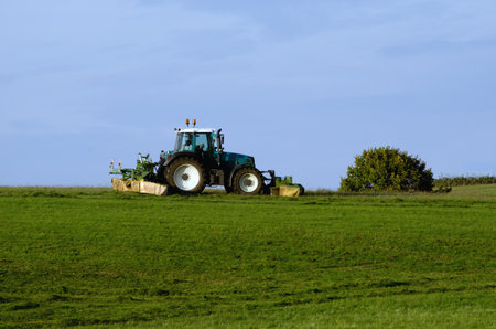Agricultural machinery cutting grass, creating neat hay rows under overcast skies