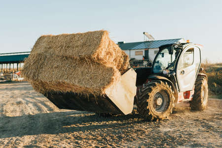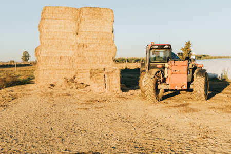 Farmer unloading round bales of straw from Hay Trailer with a front end loader. Store hay at farm. Hay rolls as Forage feed for beef and dairy cattle, sheep and horses. Making hay in autumn season.