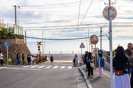 Kanagawa, November - 13.2023: The Enoden Line with the sea as a background at Kamakura Kokomae station, one of the scenes in the anime Slamdunk, is a popular tourist attraction in Kamakura, Japan.