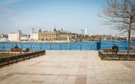 Istanbul, Turkey - March 29, 2016: People are spending their leasure time on the Kadikoy coastine with a view to the Hayderpasa train station in Istanbul, Turkey