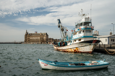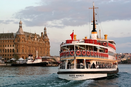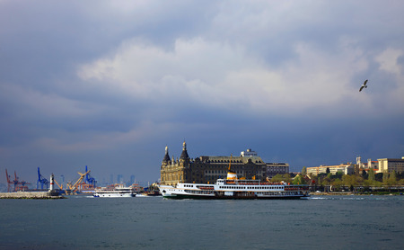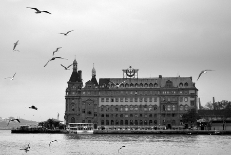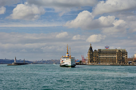 Istanbul, Turkey - January 19, 2013: Istanbul throat historic Haydarpasa train station and the ferry. Ferries in Istanbul commuter ferries have been operating on the Bosphorus since 1851. Boats have traversed the waters of the Bosphorus for millennia an
