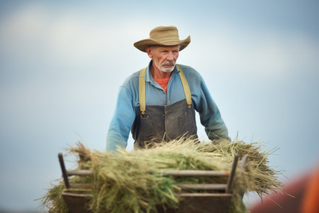 A Scandinavian man in a rustic outfit and wide-brim hat stacks hay in a serene meadow. Captured on a summer afternoon, the scene exudes a calm, pastoral ambiance with natural light.