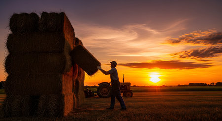 A hardworking farmer stacking square hay bales in a field during a dramatic golden sunset. A tractor is parked in the background, capturing the essence of agricultural labor and the harvest season in the countryside.