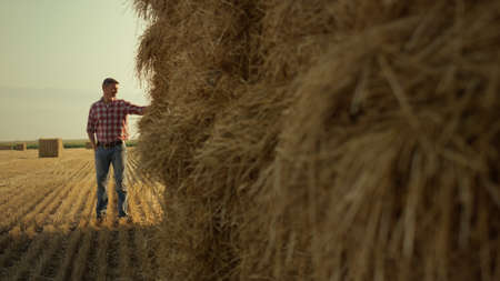 Farmer checking hay stack in stubble field. Thoughtful man agronomist inspecting collected grain harvest in agricultural farmland. Successful businessman worker touching wheat bales at countryside.
