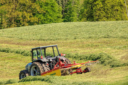 Zug, Switzerland - 6 May, 2016: countryside view with a tractor standing on a hill. The town of Zug is the capital of the Swiss canton of Zug.