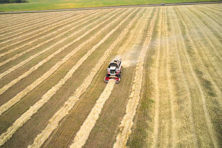 Harvester machine working in field . Combine harvester agriculture machine harvesting golden ripe wheat field. Agriculture. Aerial view. From above.